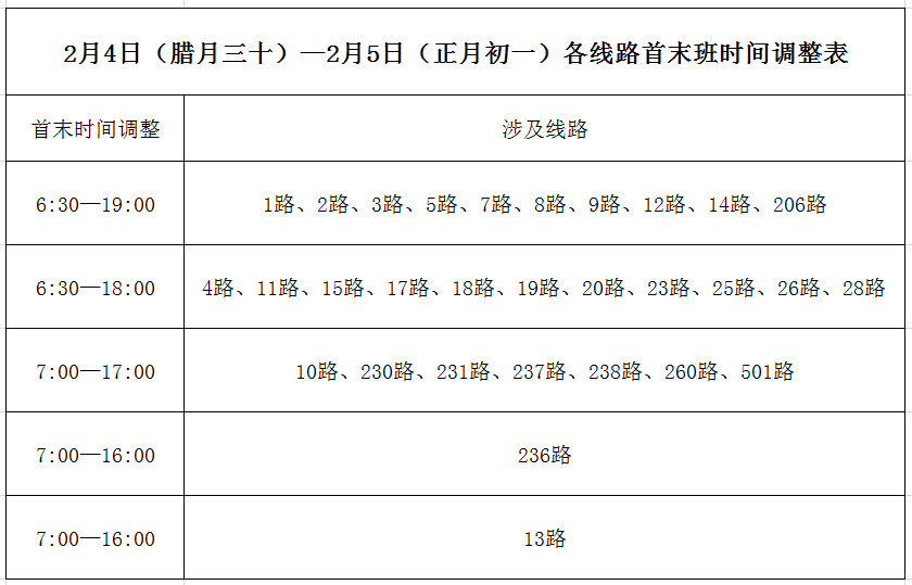 (一)2月4日、5日(三十、初一)首班延后發(fā)車、末班提前收車,具體明細見下表: